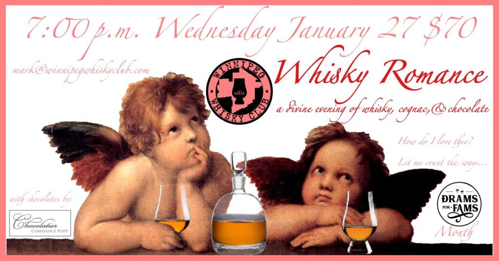 Whisky Romance will be conducted via zoom, with event package by pickup only(with exceptions) at Mark Kaufmann’s house in St Vital.