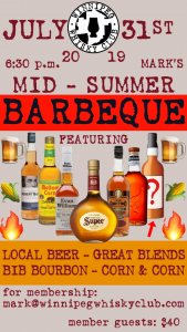 Details of July 31st’s Winnipeg Whisky Club Night V A barbecue featuring local beer, blended Scotch, bourbon, corn whiskey, and corn on the cob!